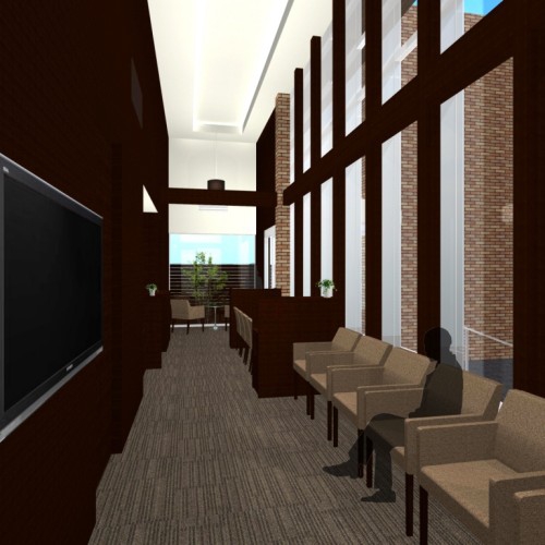 受付、待合は落ち着いた木目調の壁を用い、窓を全面ガラス張りにする事により、リラックスした雰囲気でおくつろぎ頂ける空間となっております。